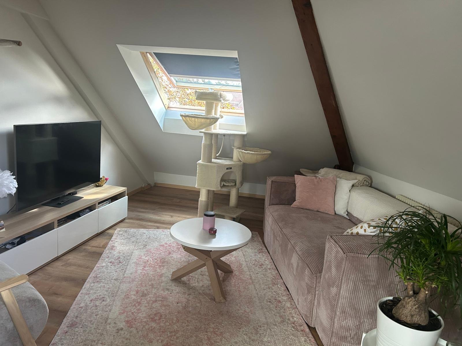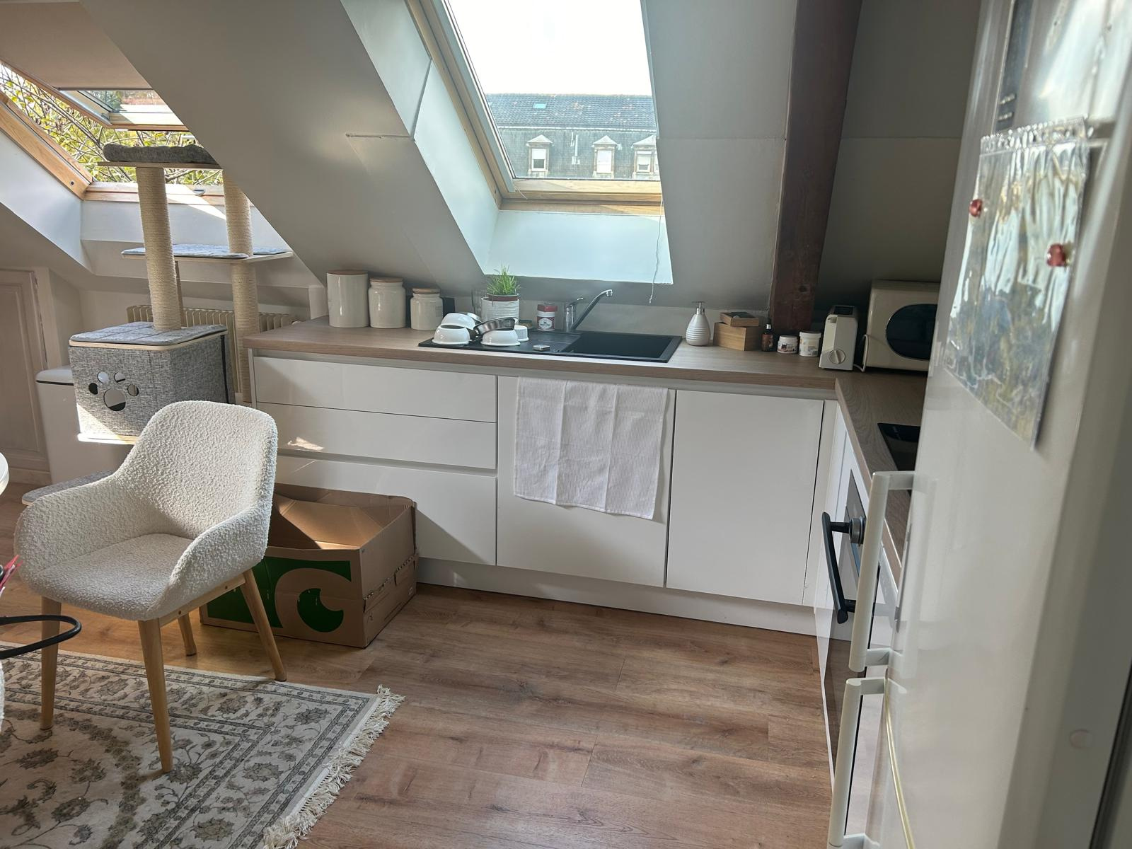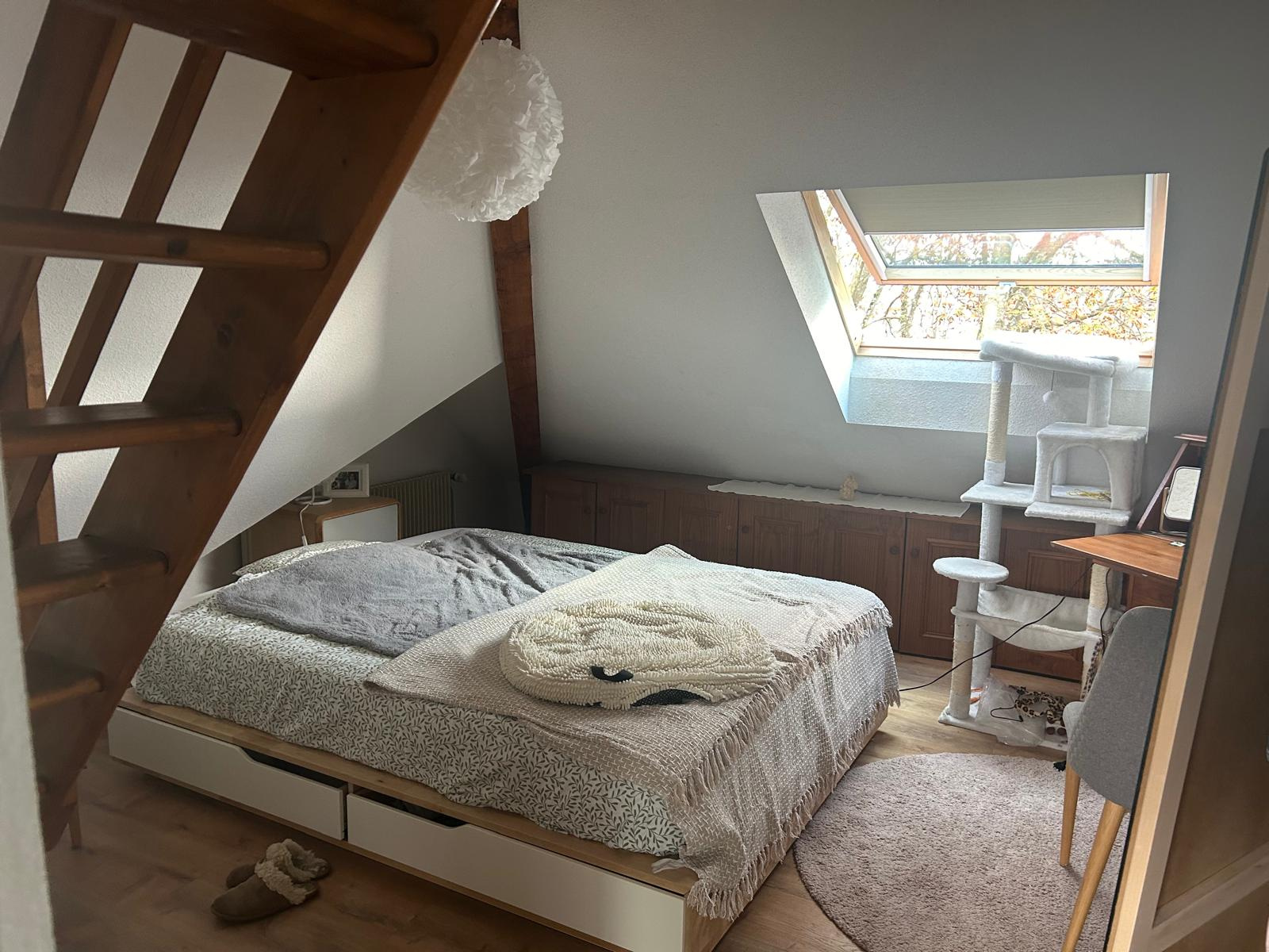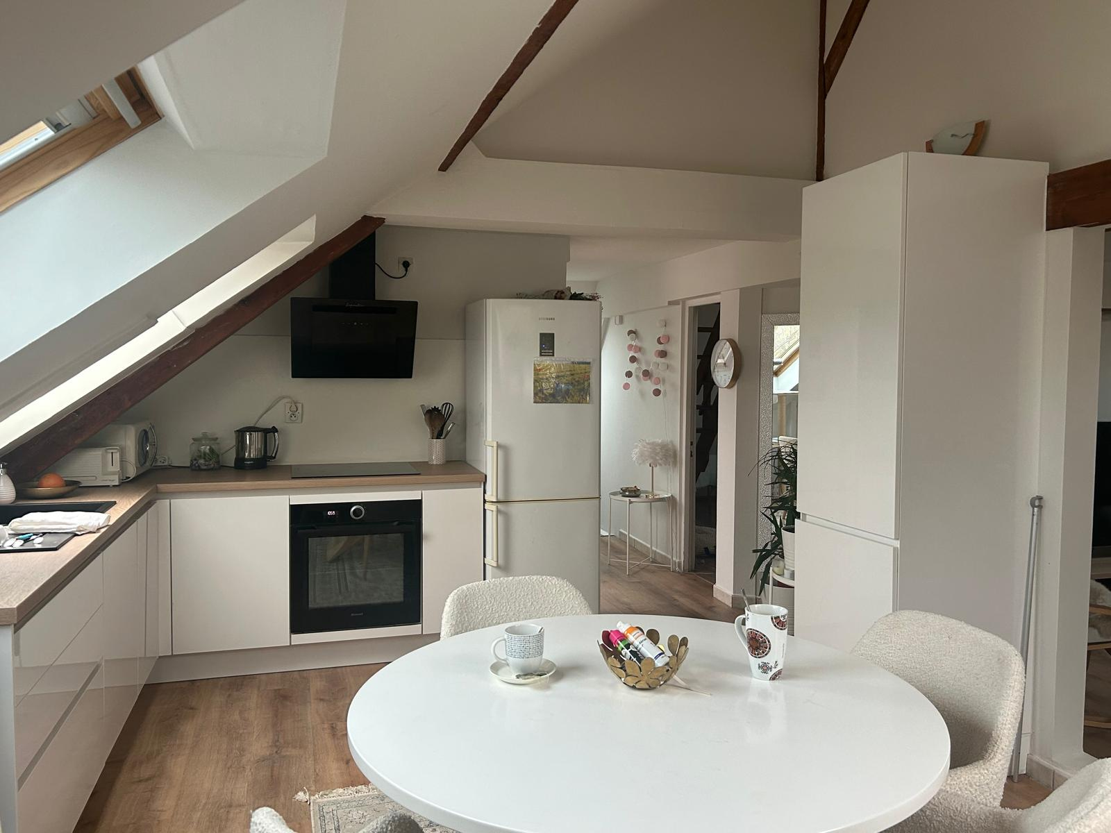 Coquet appartement refait à neuf de type F2 au dernier étage de 76m² au sol, immeuble de 3 appartements, proche commodités centre-ville MULHOUSE, Rue Schlumberger comprenant une belle cuisine équipée complète ouverte sur un séjour traversant parquet stratifié neuf, velux, pas de travaux à prévoir. Une salle de bains équipée avec WC, une chambre avec accès petite mezzanine. Chauffage au gaz individuel. Faible charges de copropriété. Taxe foncière 526€. Appartement bien isolé DPE : C
