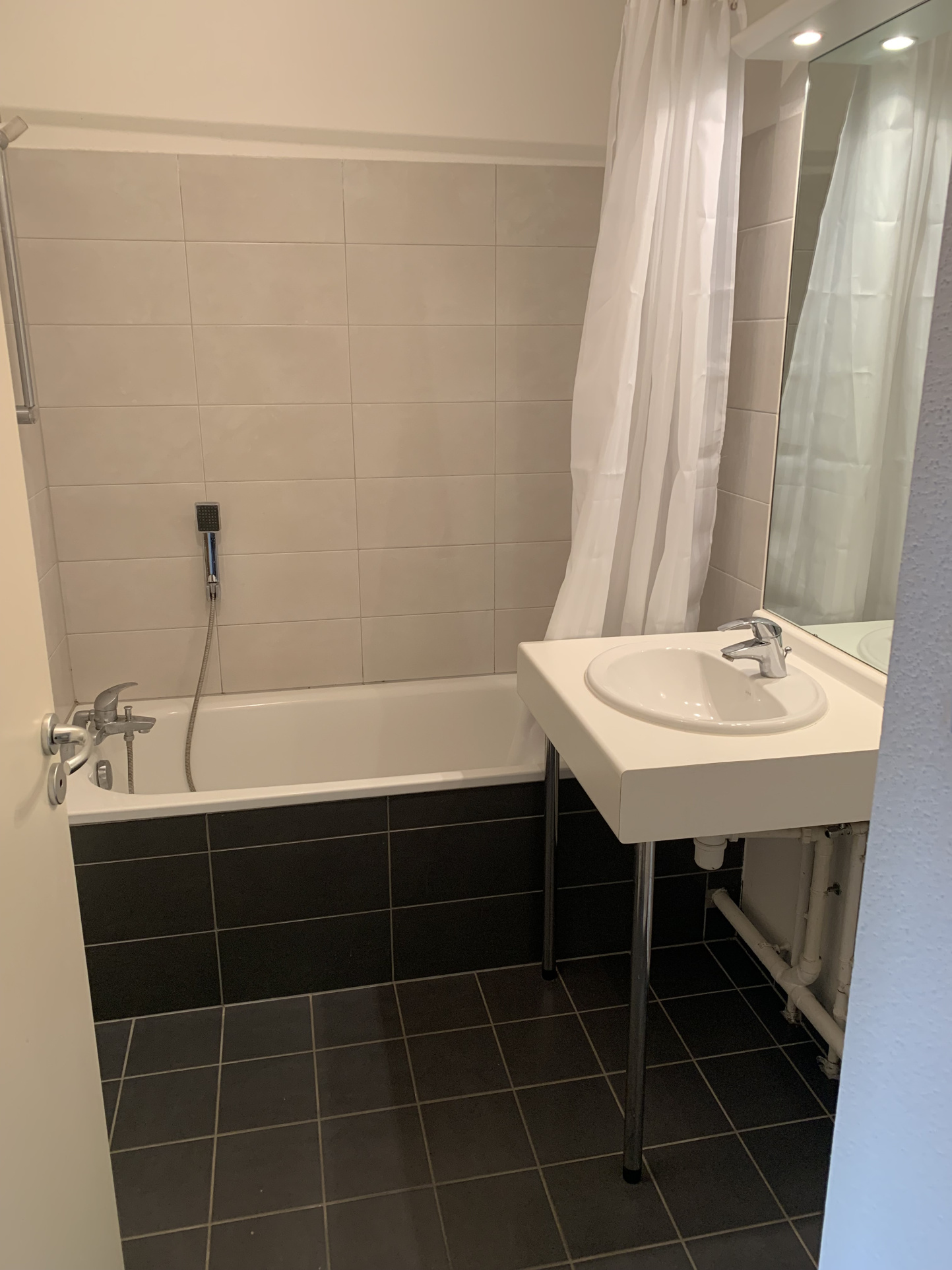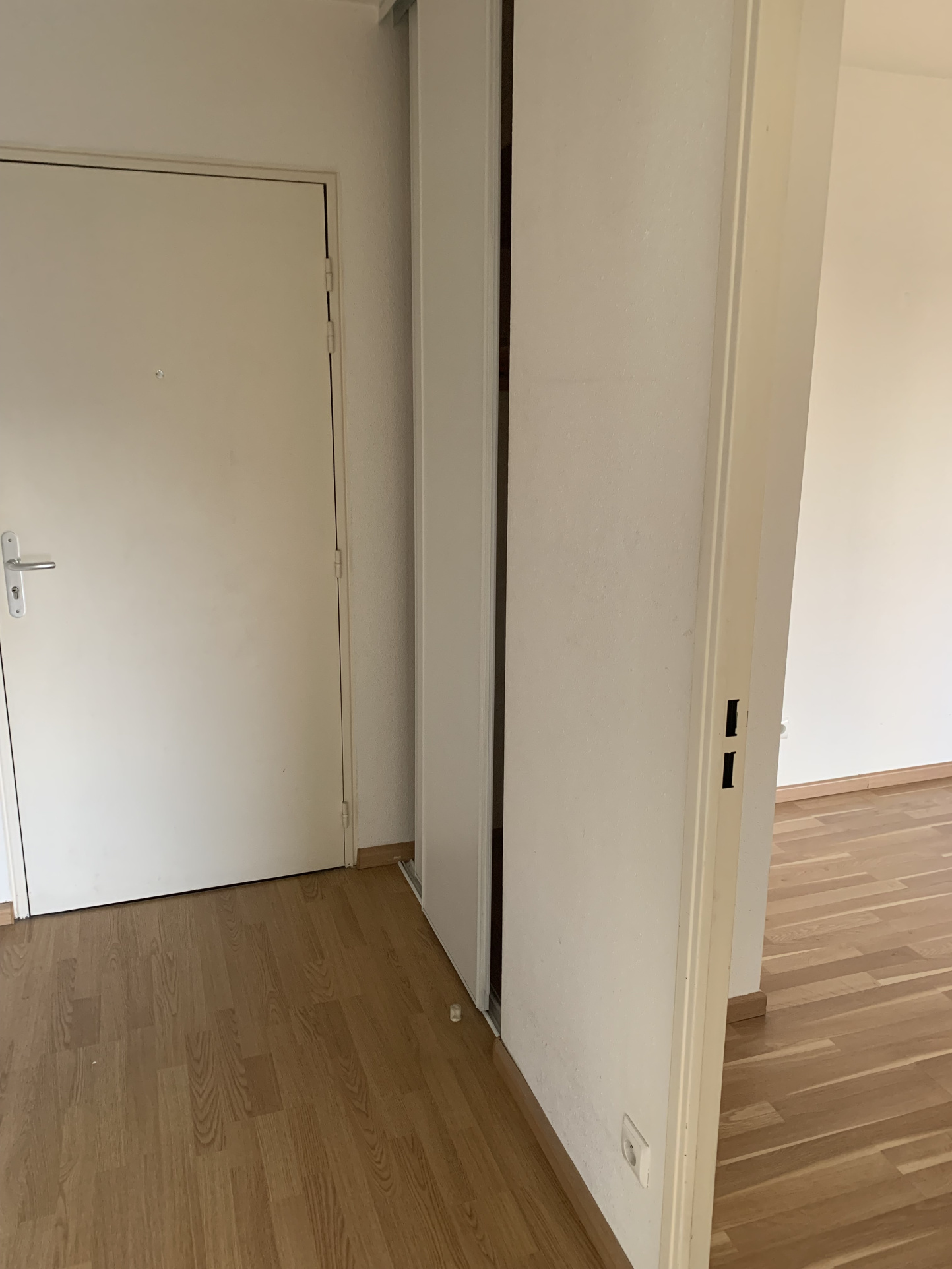 Bel appartement F2 au 1er étage avec ascenseur comprenant un hall d'entrée avec placard, une cuisine semi-équipée (plaque et hotte) ouverte sur un séjour donnant accès sur un balcon, une chambre donnant accès sur le balcon, wc séparé et une salle de bains. Un parking privatif. Chauffage individuel au gaz.