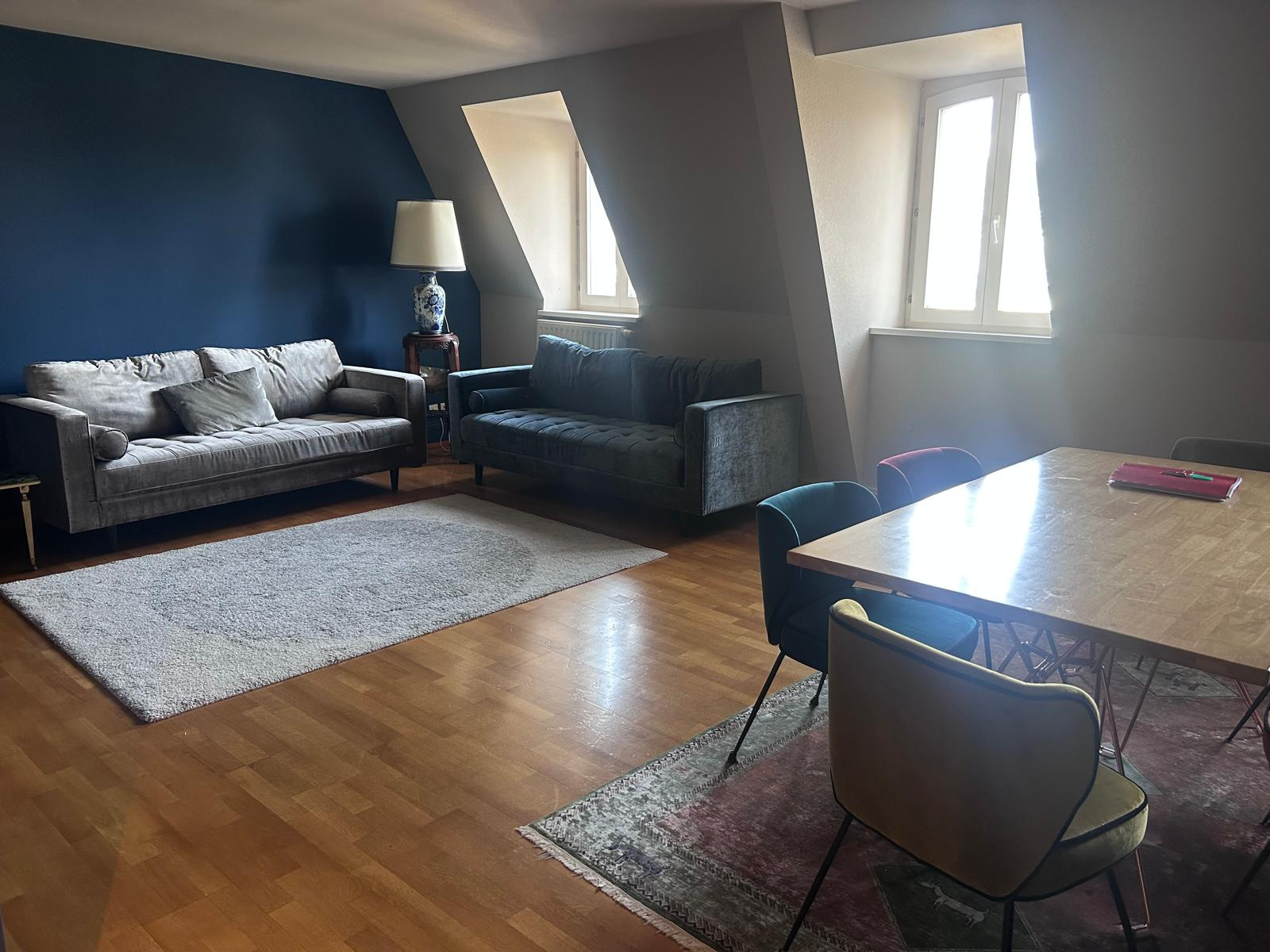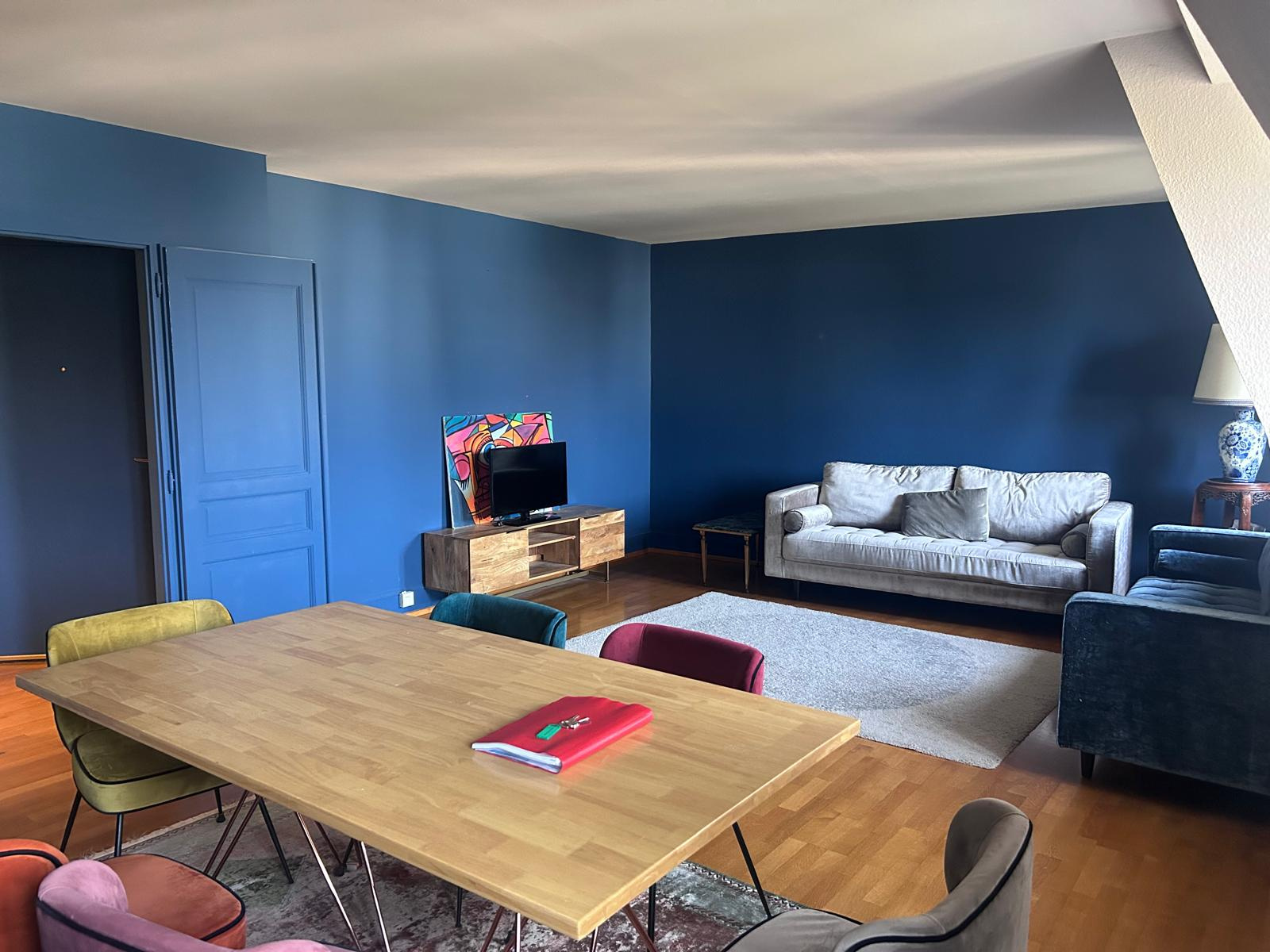 Centre historique : Magnifique appartement en duplex au dernier étage dans maison de maitre, spacieux de 92.74m² au sol comprenant un hall d'entrée, une grande pièce à vivre salon séjour avec fenêtres, une grande cuisine équipée séparée, un WC séparé. A l'étage une mezanine, 2 chambres, une salle de douche équipée. Possibilité d'acheter les meubles en place. Quartier résidentiel en face du parc STEINBACH. Chauffage et eau collectif. Une grande cave. Copropriété très bien entretenue.
